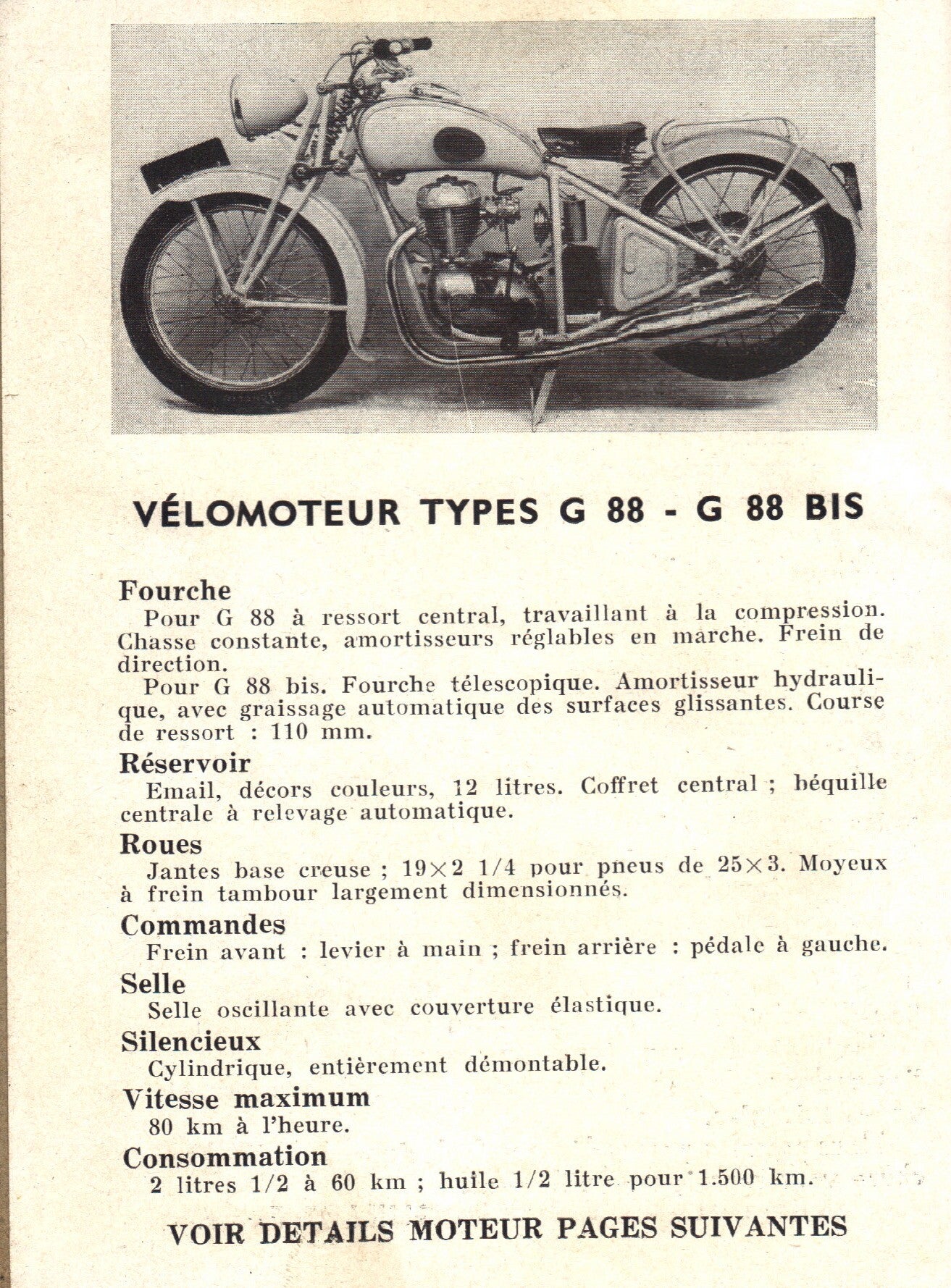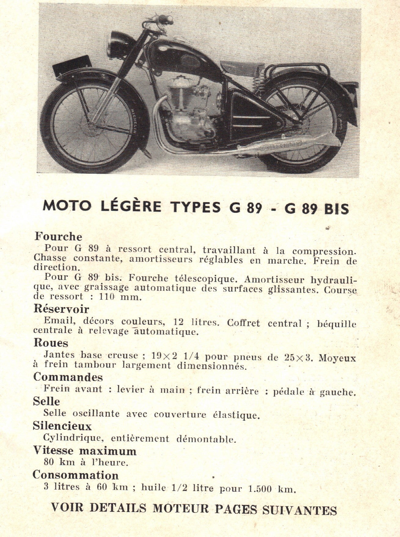 Moteur monocylindre 4 temps refroidi par air - 2 soupapes - 349 cm3 (75 x 79 mm) – Simple arbre à cames en tête, distribution par arbre et couple conique - Carburateur Longuemarre - Allumage Magnéto - Éclairage par dynamo séparée entrainée par poulies depuis le volant moteur - Lubrification par carter humide et pompe à engrenages - Boite 3 vitesses par levier direct - Embrayage multidisque humide tout métal - Transmissions primaire par engrenages, finale par chaîne - Cadre double berceau tubulaire ininterrompu - Fourche à parallélogramme type Webb - Pas de suspension arrière - Freins avant et arrière à tambour - Pneus av. et ar. 4.00 x 19" - 145 kg - 105 km/h.