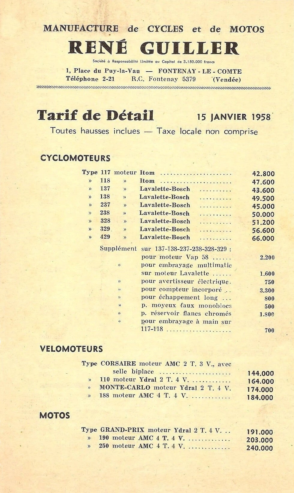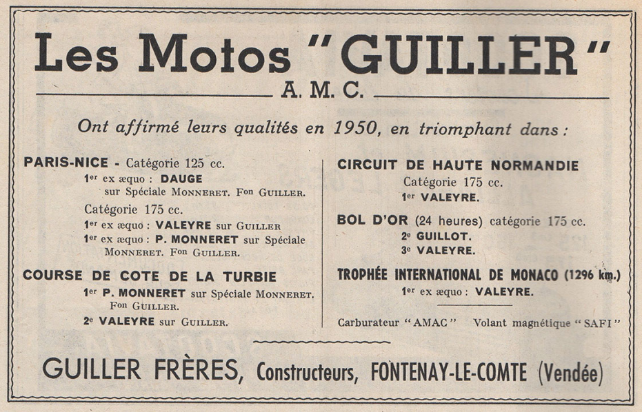 Tout à fait naturellement, l'industrie automobile et motocycliste s'est principalement développée autour de la capitale et dans le fameux Triangle d'or réunissant Lyon, Saint-Étienne et Grenoble. Mais alors pourquoi des constructeurs sont-ils nés dans des régions improbables, comme Fontenay-le-Comte en Vendée, en lisière du marais poitevin et loin de tous les fournisseurs traditionnels indispensables à un constructeur. La faute à Pierre Guiller qui s'installe à Fontenay-le-Comte 1890. D'abord chapelier, puis bureau de tabac. Ses deux fils, René, coureur cycliste, et Pierre, se lancent avec un grand succès dans le commerce, puis la fabrication de vélos en 1911. Spécialisés au milieu des années 20 dans les fournitures en gros pour cycles et automobiles.