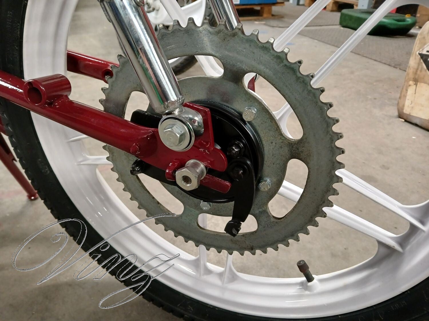 Remplacement des vis de garde boue, peinture de la flasque de frein et pose du renvoie de roue.