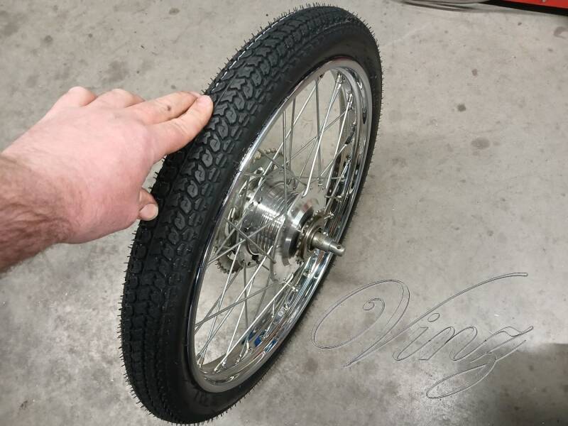 Nettoyage et polissage du moyeu, microbillage de la flasque de frein, remplacement de garniture de frein, rayons, jante et pneu neuf.