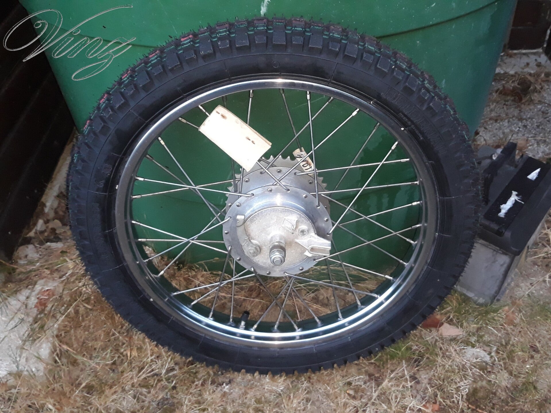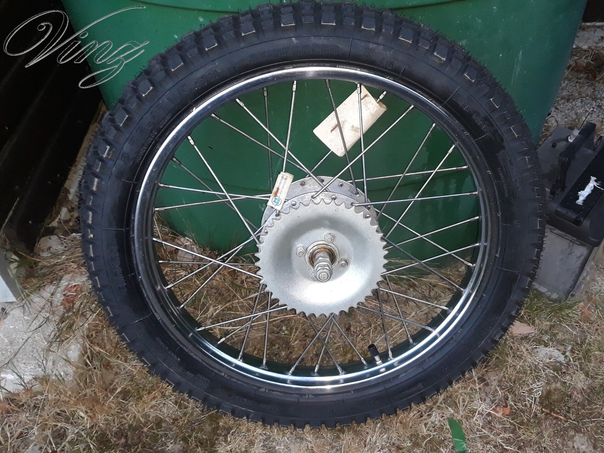 Dans mon stock je suis tombé sur une roue arrière neuve d'époque (je ne savais même pas que j'avais ça !!).