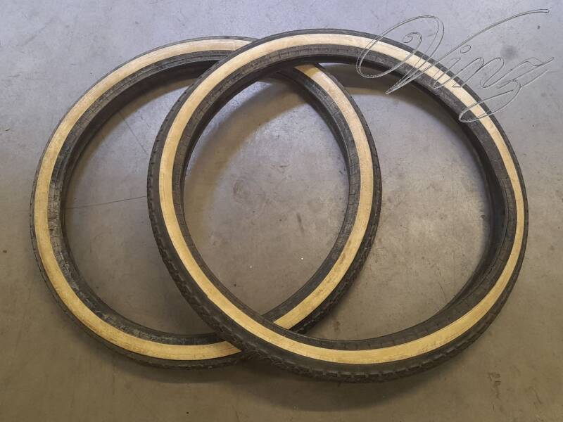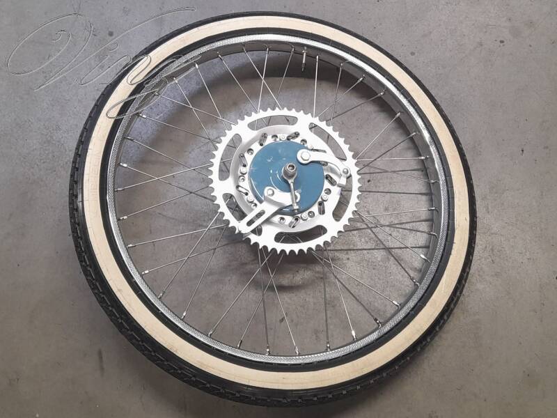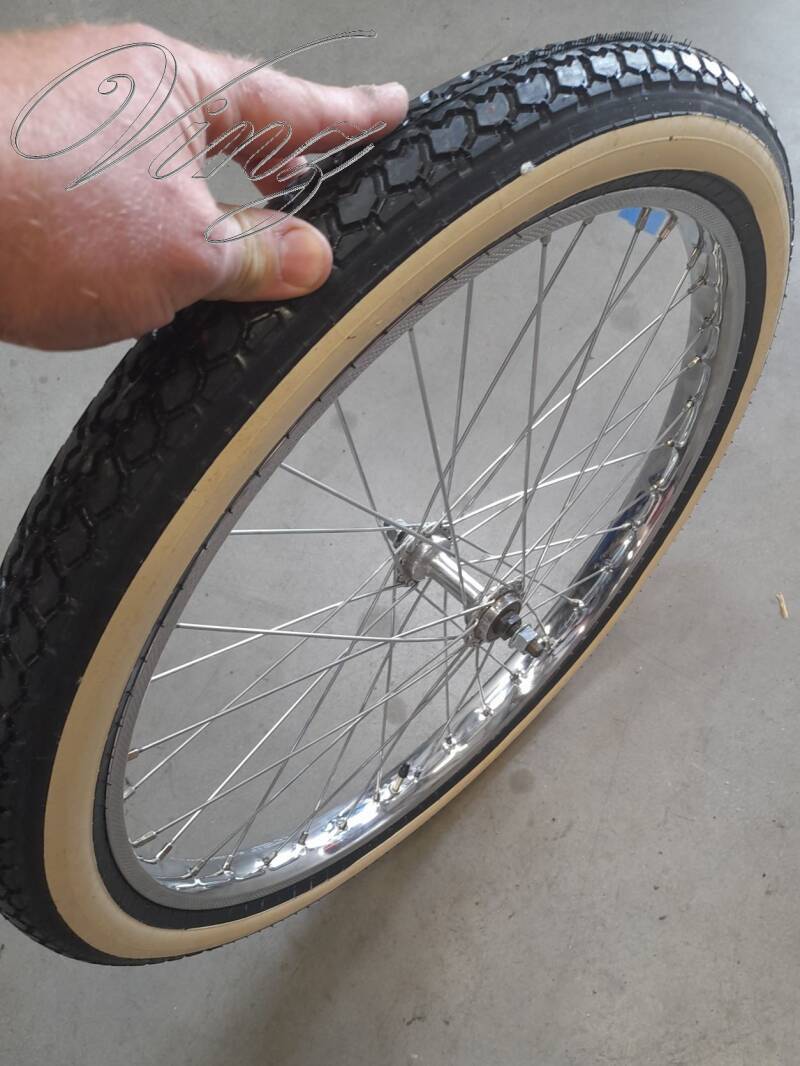 La roue avant, avec un moyeu d'occas trouvé dans mon stock, une jante et des rayons neufs et des pneus Michelin neufs d'époque.