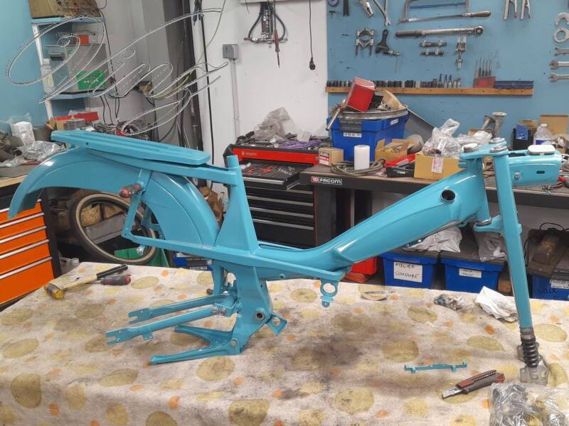 Pose des silentblocs, de l'axe de pédalier, du robinet et du moteur.