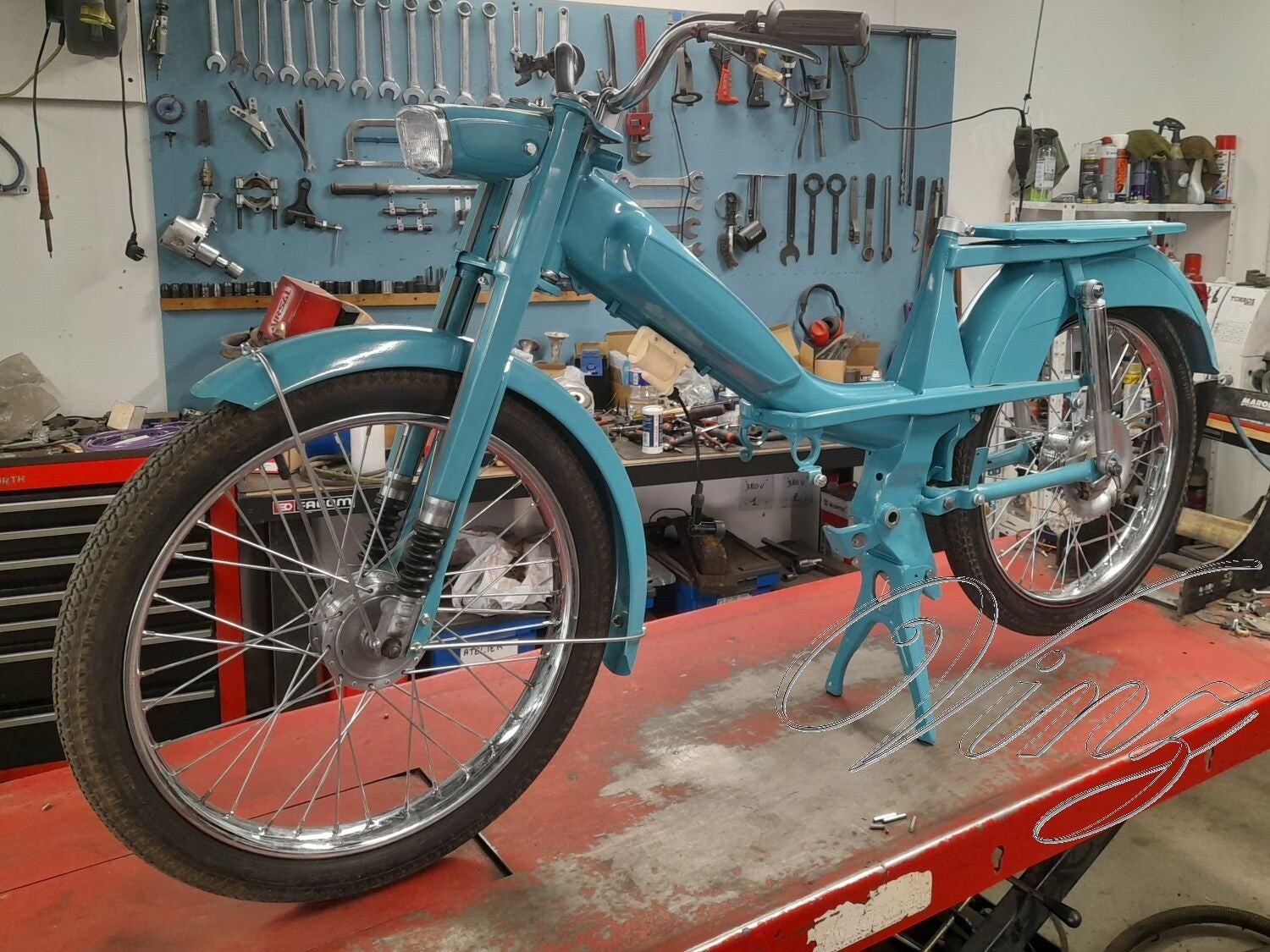 Je refixe le moteur et je la complété avec : des carters latéraux, un guidon, des poignées et la roue avant prise dans les pièces de N40.