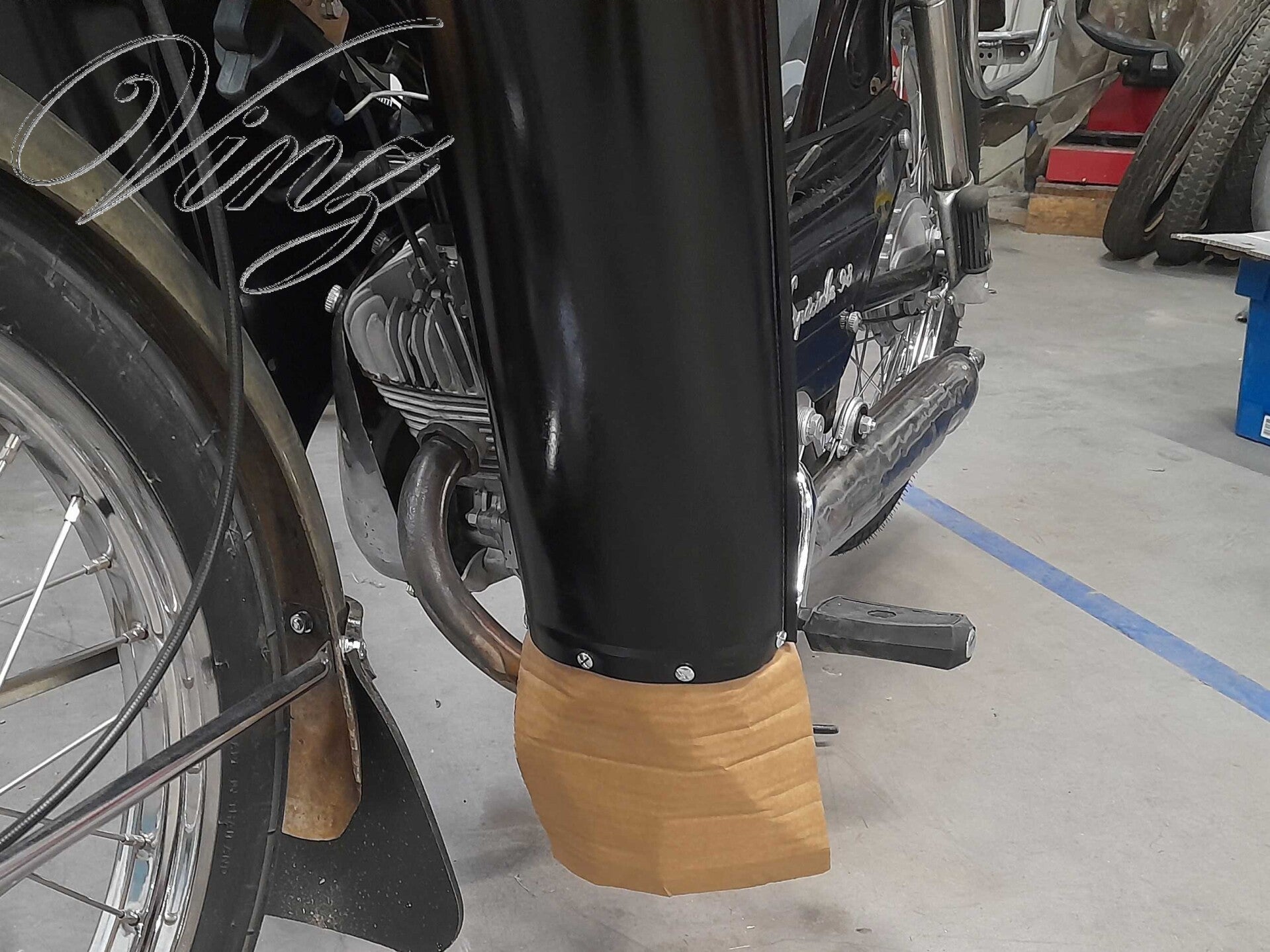 Remplacement du garde boue avant par un rechromé. J'ai du reremplacer la bavette car celle que j'avais mis s'est déchiré.
