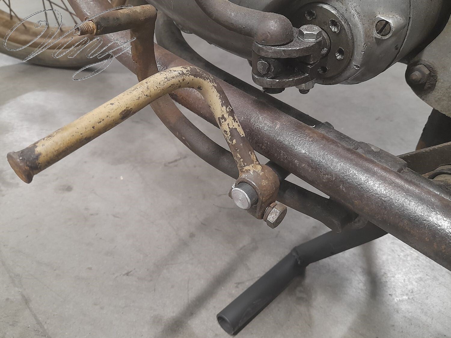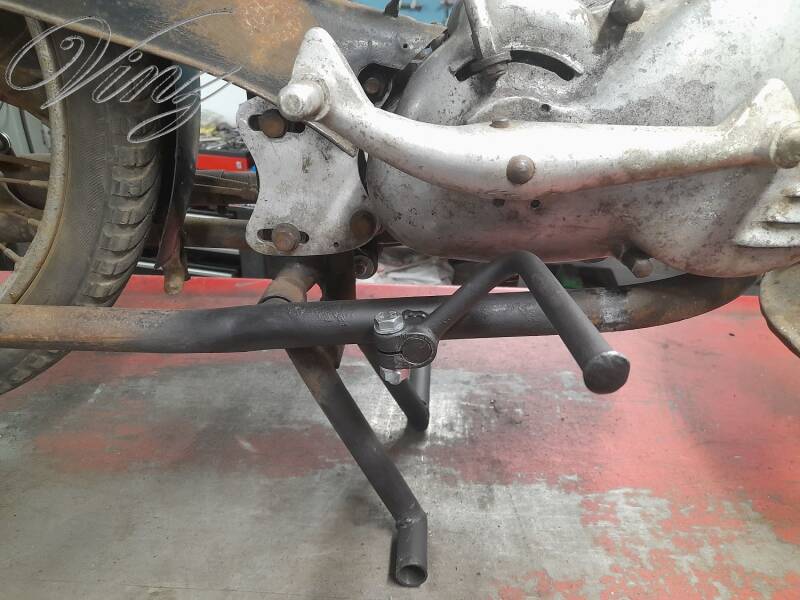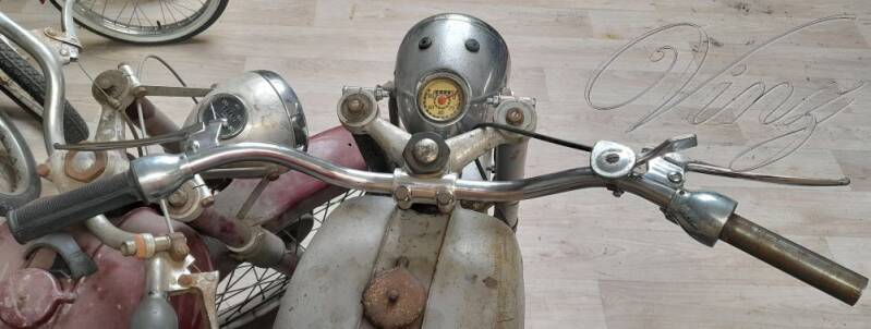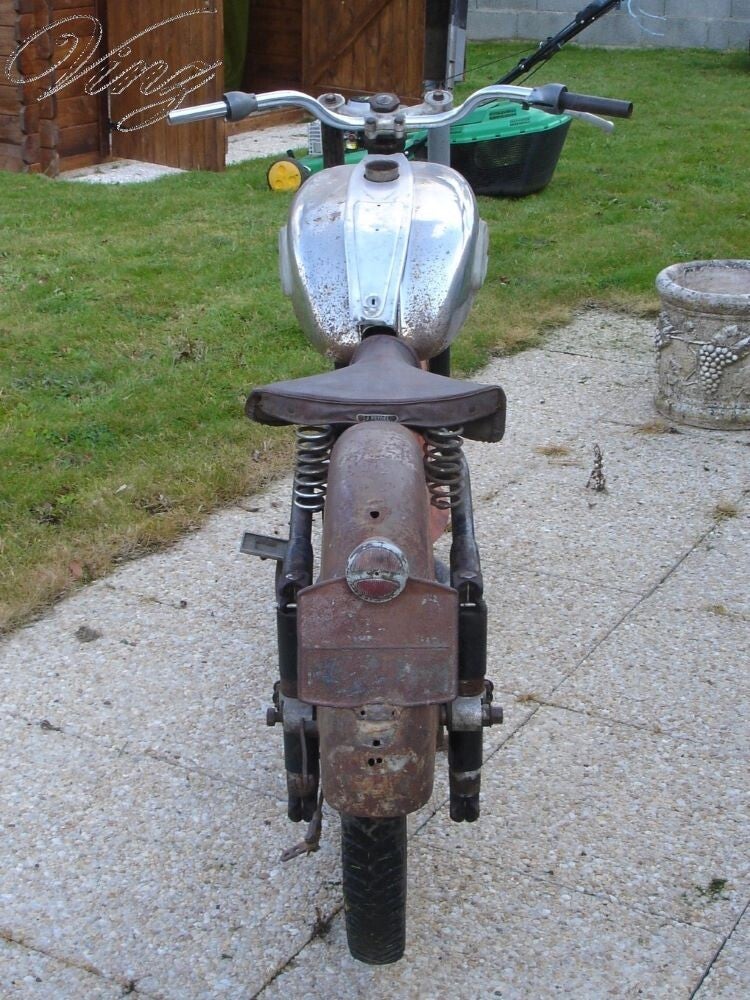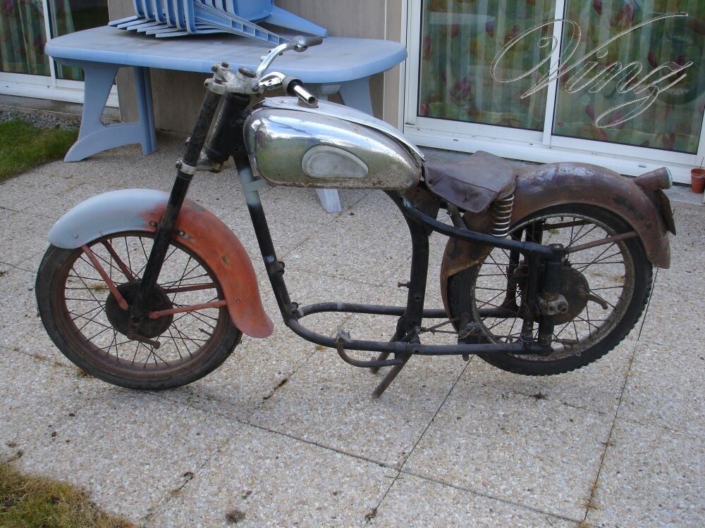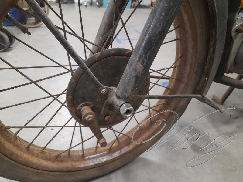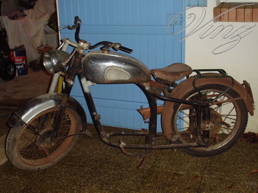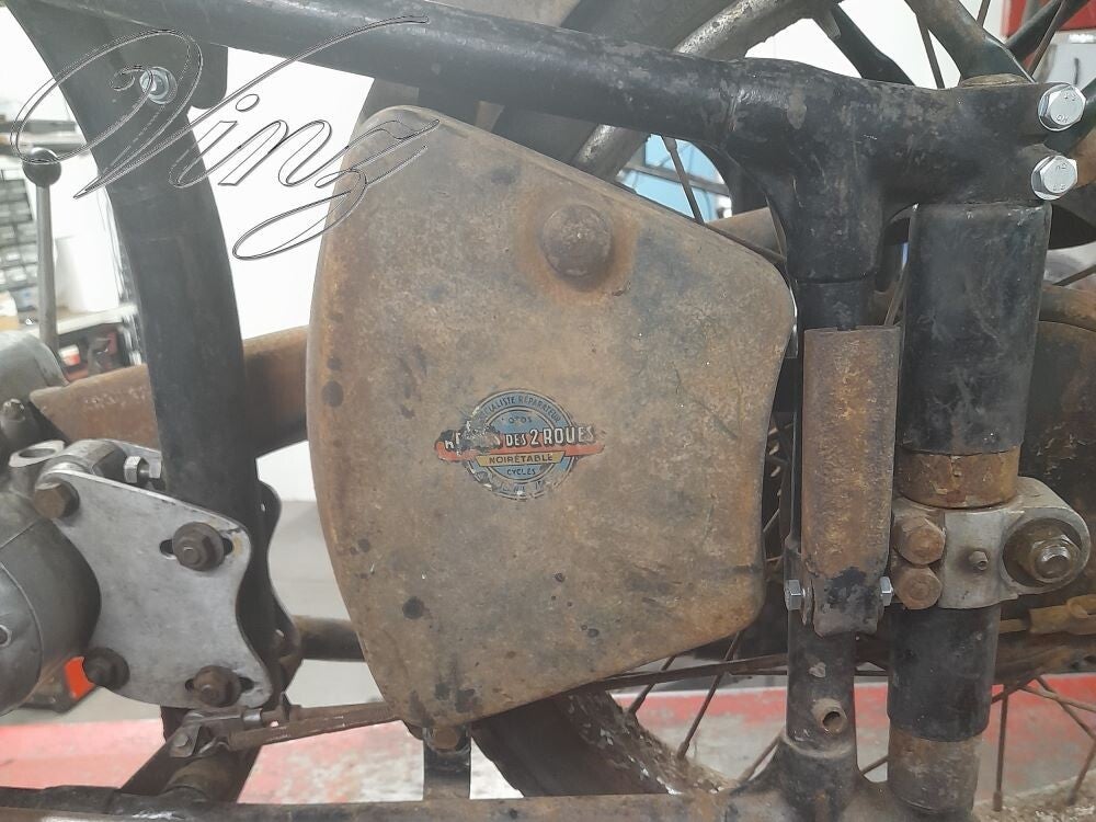 La fourche avait était bidouillé pour adapter une roue de Motobécane mais la roue d'origine était fournis avec. Le guidon était tordu et le moteur était grippé.