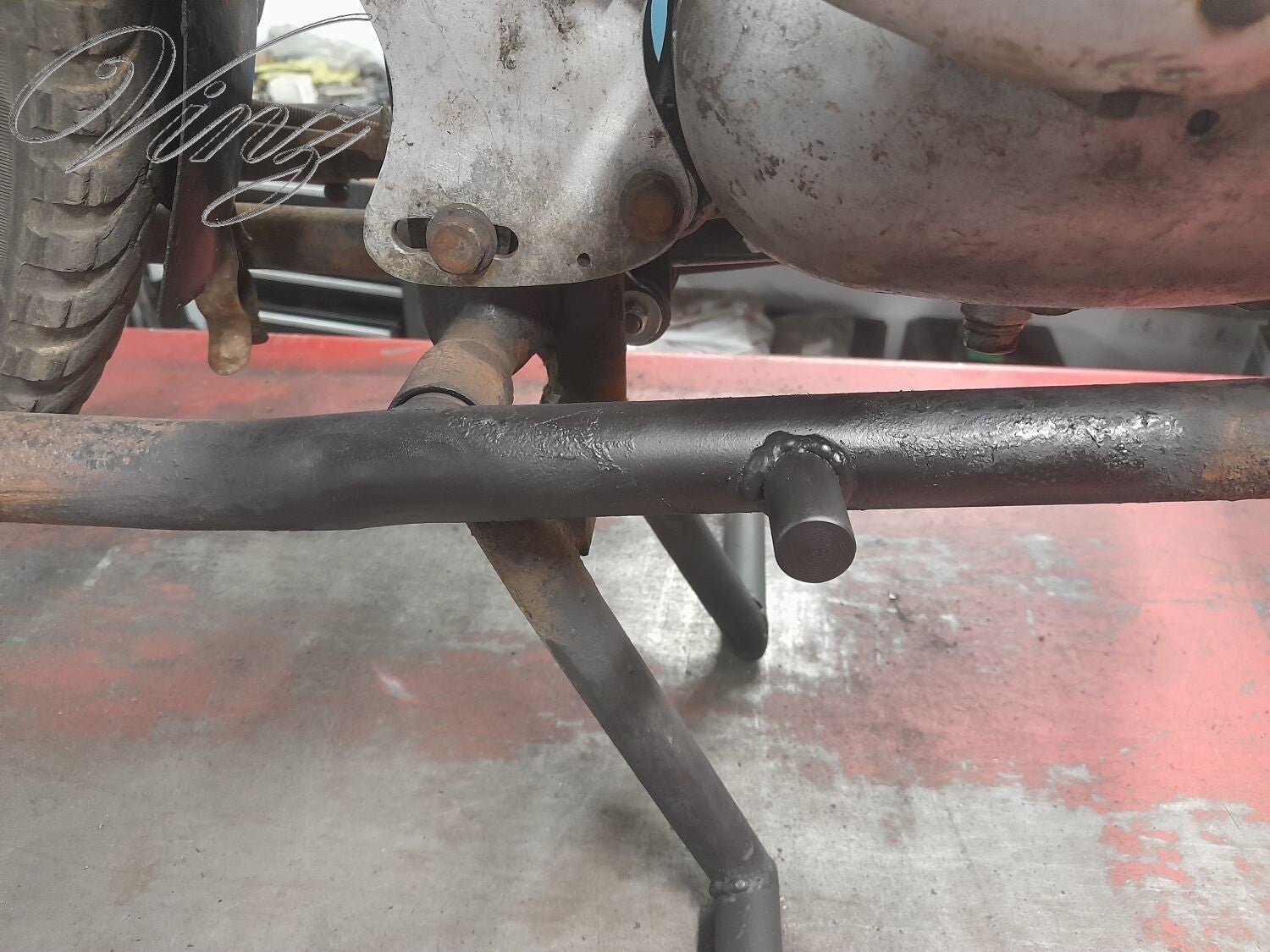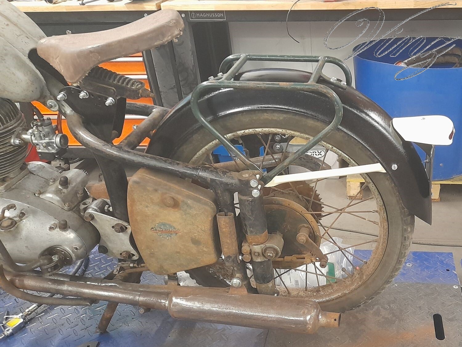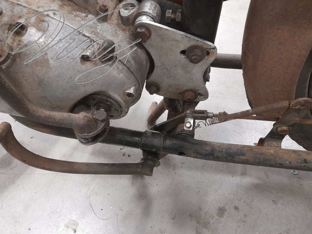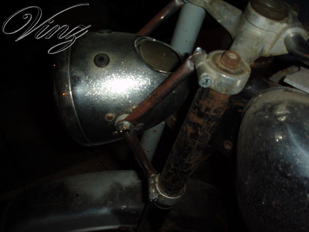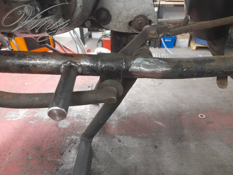 La fourche avait était bidouillé pour adapter une roue de Motobécane mais la roue d'origine était fournis avec. Le guidon était tordu et le moteur était grippé.