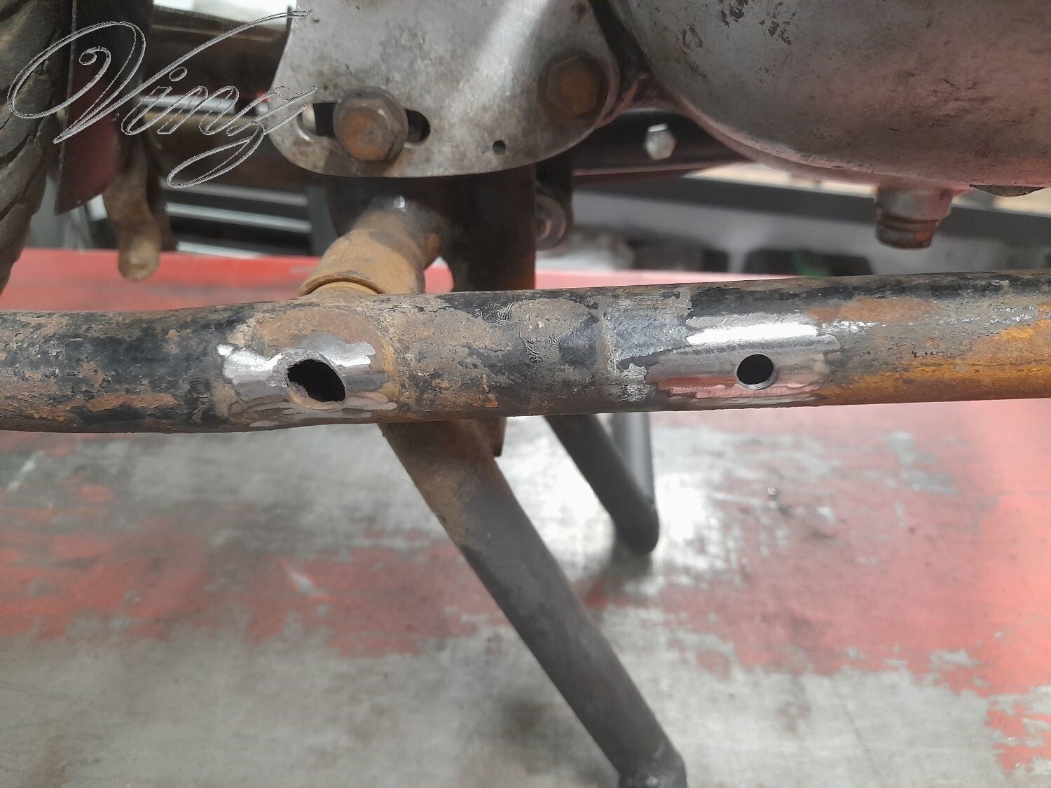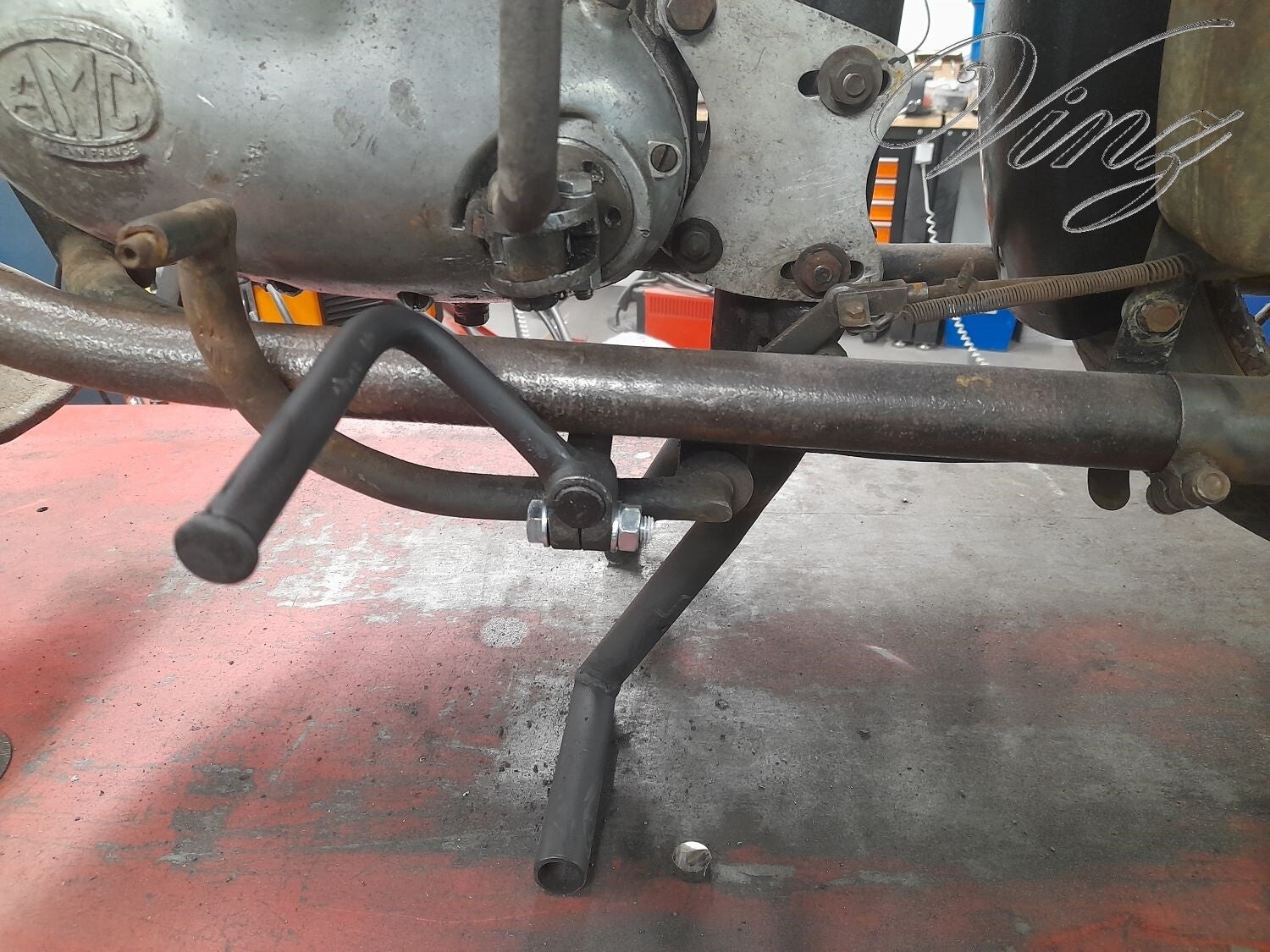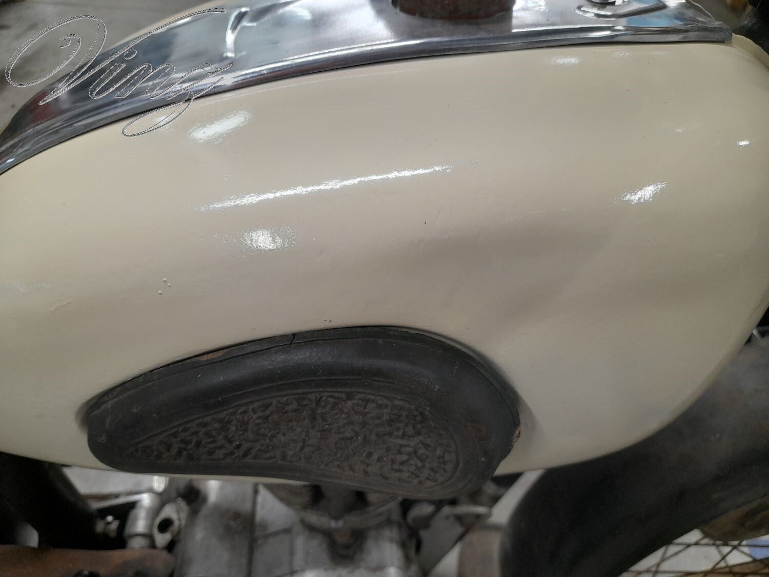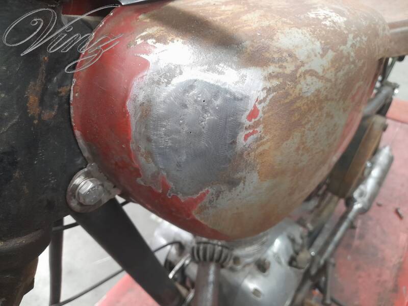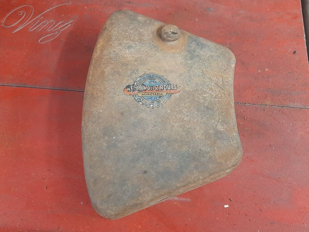Sur le réservoir rouge qui y avait dessus, il y avait des pattes de fixation cassé, j'ai trouvé un autre réservoir (le même mais chromé) ainsi qu'un guidon. j'avais trouvé ces pièces à la bourse des coupes moto légende à Montlhéry.