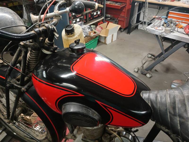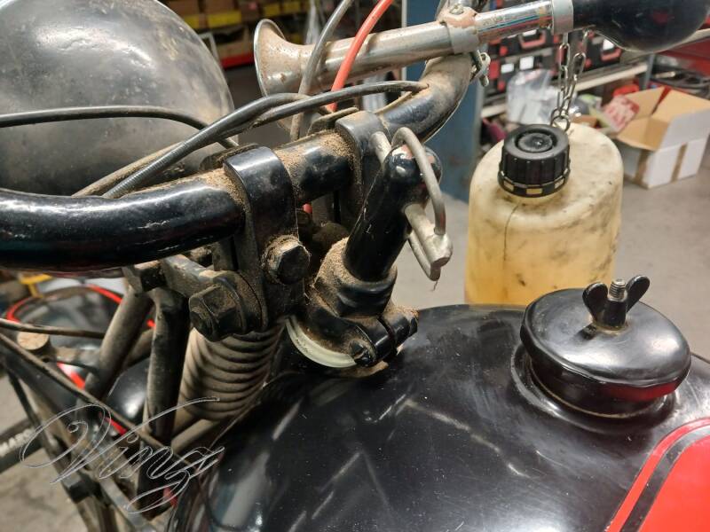 La moto est très poussiéreuse mais on devine une ancienne restauration qui n'a pas trop mal vieilli.