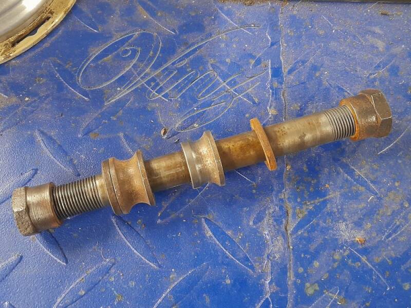 J'ai réutilisé l'axe de celle-ci, j'ai remis en état le nouveau moyeux en le complétant avec des morceaux pris sur une autre roue.