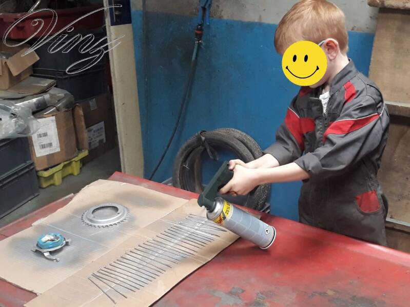 Une fois poncé et âpreté, la phase peinture. Léo a choisi un vert.